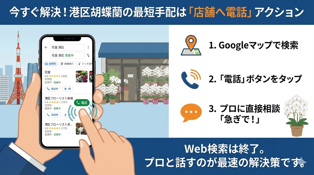 港区での胡蝶蘭手配は時間との戦いです。特に即日手配が必要な場合、ネット上の情報を眺めている間に、店舗の営業時間は過ぎ、在庫は他社に押さえられてしまいます。路面店の最大の強みは、電話一本でプロと直接話せることです。「予算〇〇円で、〇〇へ今日中に届けたい」という要望を伝えれば、その場で可否と代替案を提示してくれます。